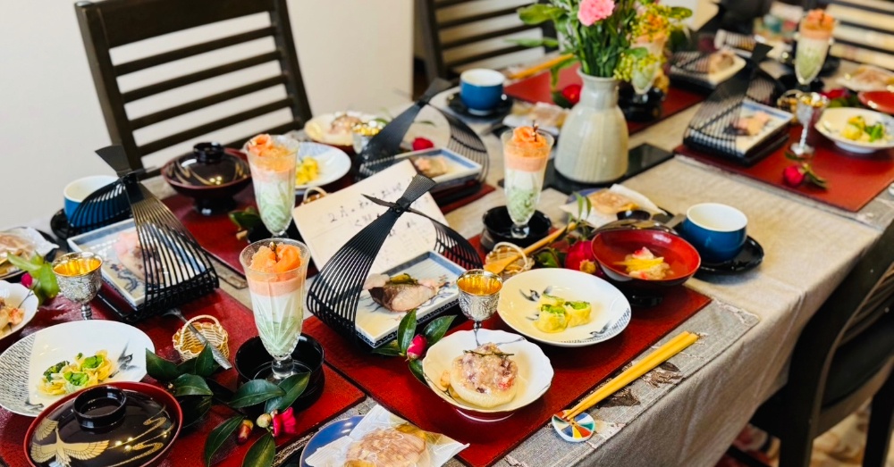 当教室では、皆様で実習して頂きましたお料理を、皆様で心和む会食をして頂き、帰られる折に、もう一人前をお持ち帰り頂き、ご家族様にご試食して頂きます。